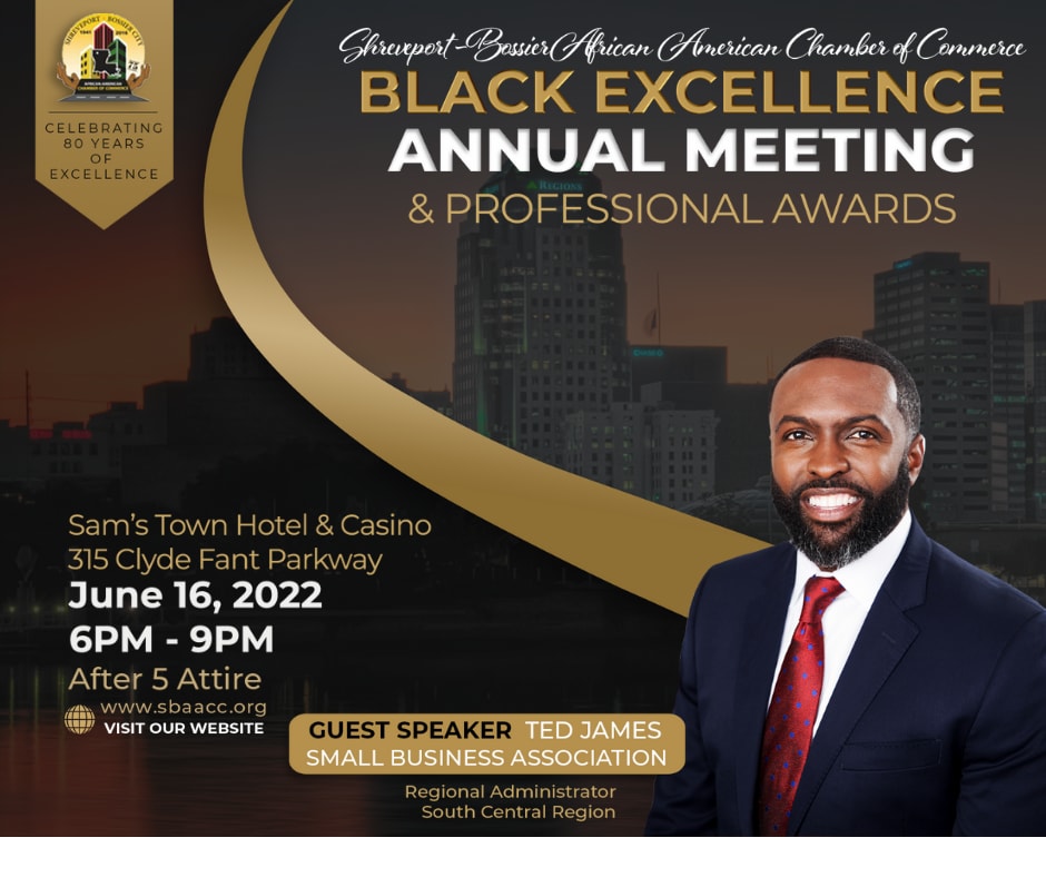 During this event the SBAACC’s Annual Meeting themed “Black Excellence” will recognize the businesses and sponsors who have partnered with the Chamber to accomplish a great number of milestones throughout the year. We will also present the Herschel Brown Civil Rights Award and the John Wilson Trail Blazer Award to two individuals that have made a positive impact on the community. We will recap many of the successes that occurred in past years and unveil some new initiatives for 2022. Our guest speaker for this year event is Regional Administrator Ted James recently appointed by President Joe Biden. Administrator James is over Region VI- Serving Louisiana, Arkansas, Oklahoma, New Mexico and Texas for U.S. Small Business Administration. We will also be recognizing businesses in this area with our Businessperson of the Year, Milestone Award, and Impact Awards.